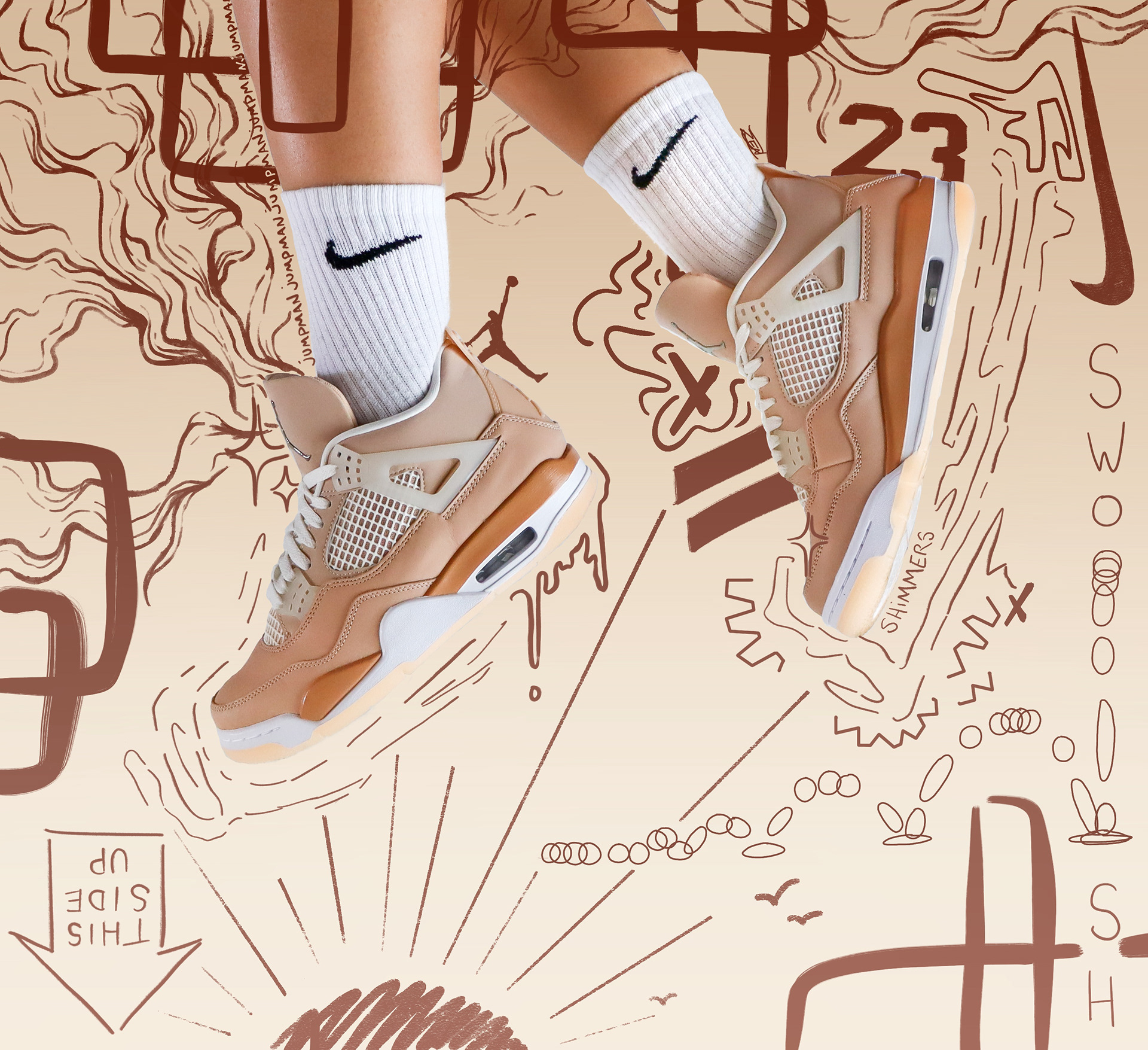 A mockup for Nike's Jordan 4 "Shimmer" colorway that came out in September 2021.