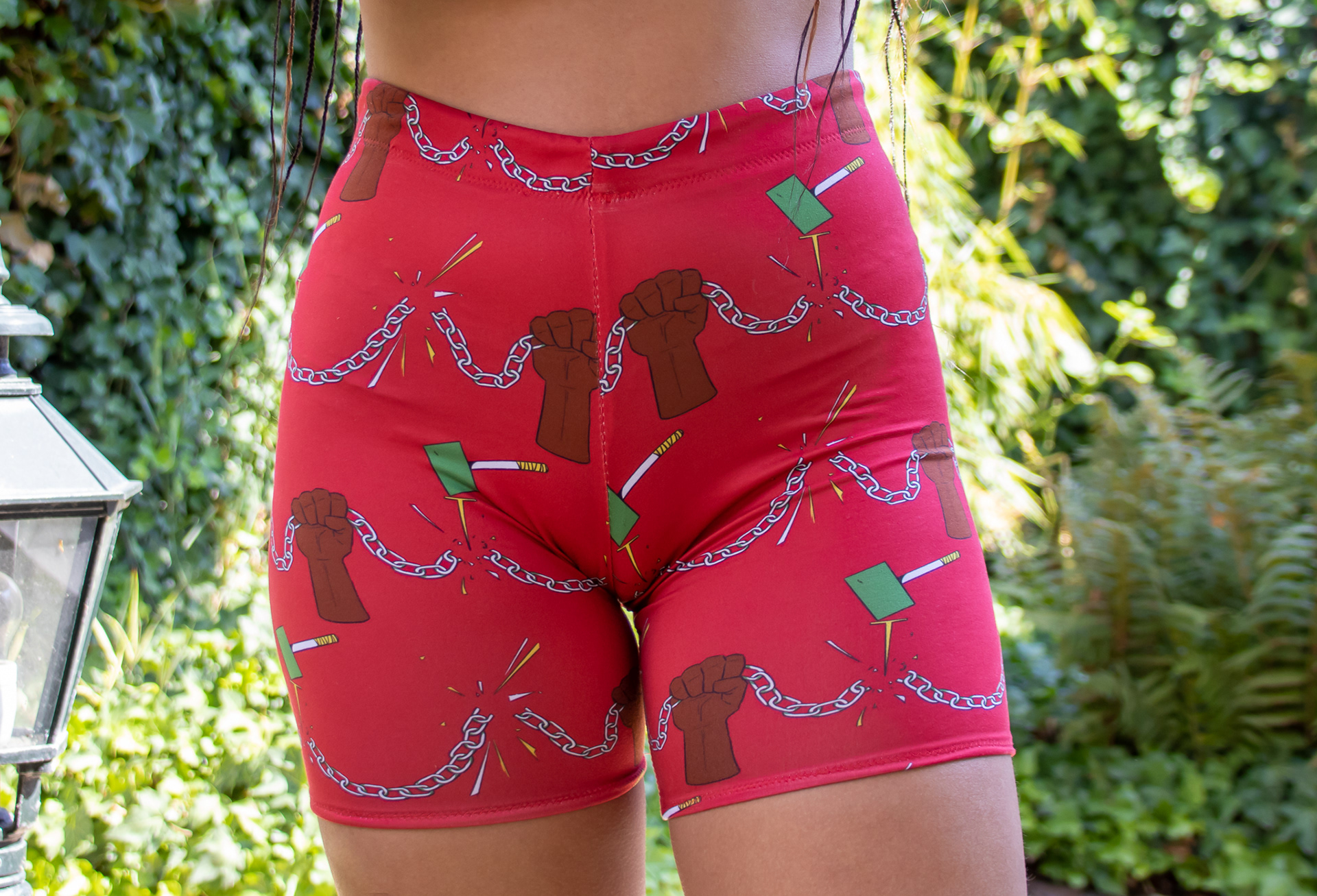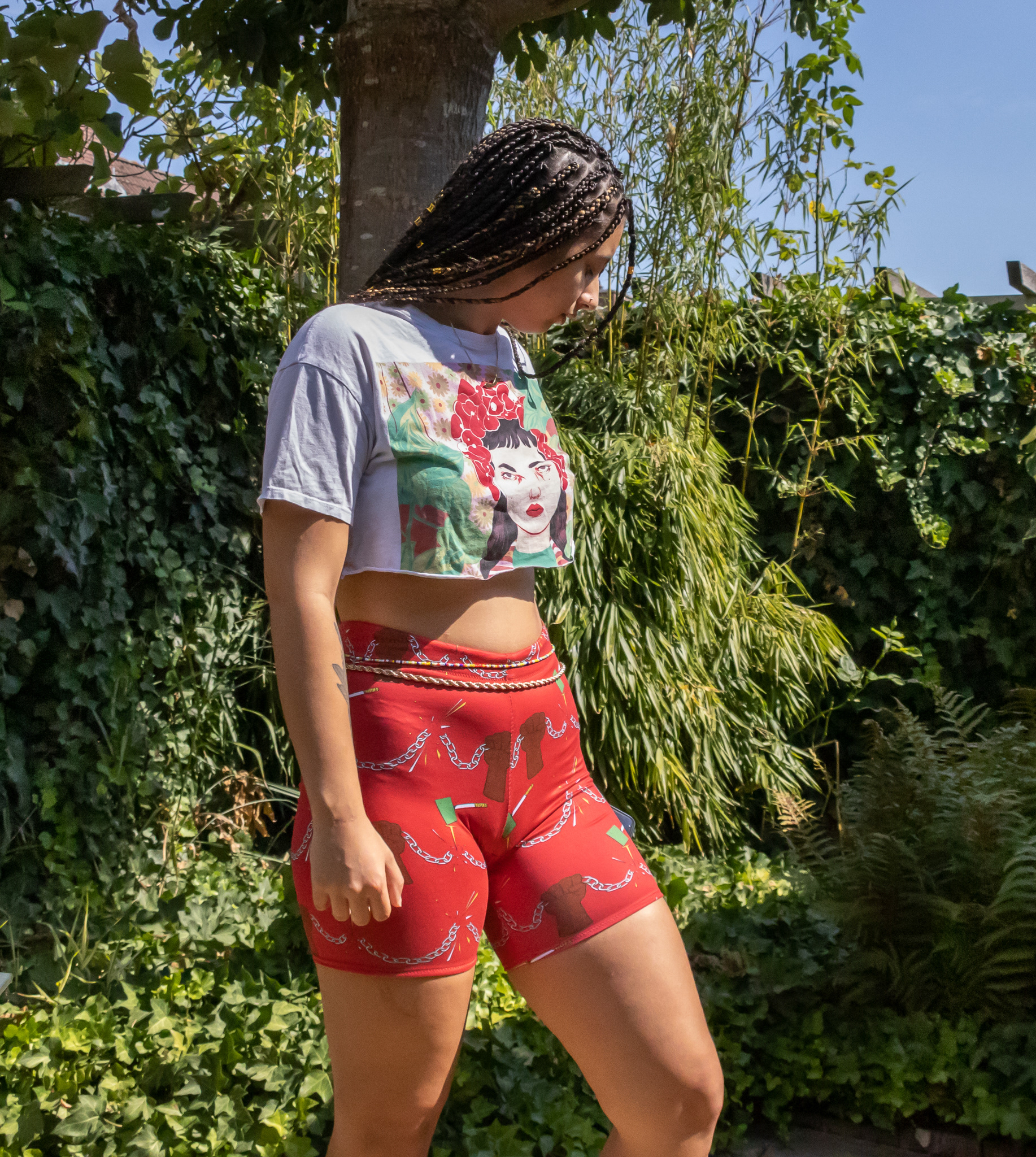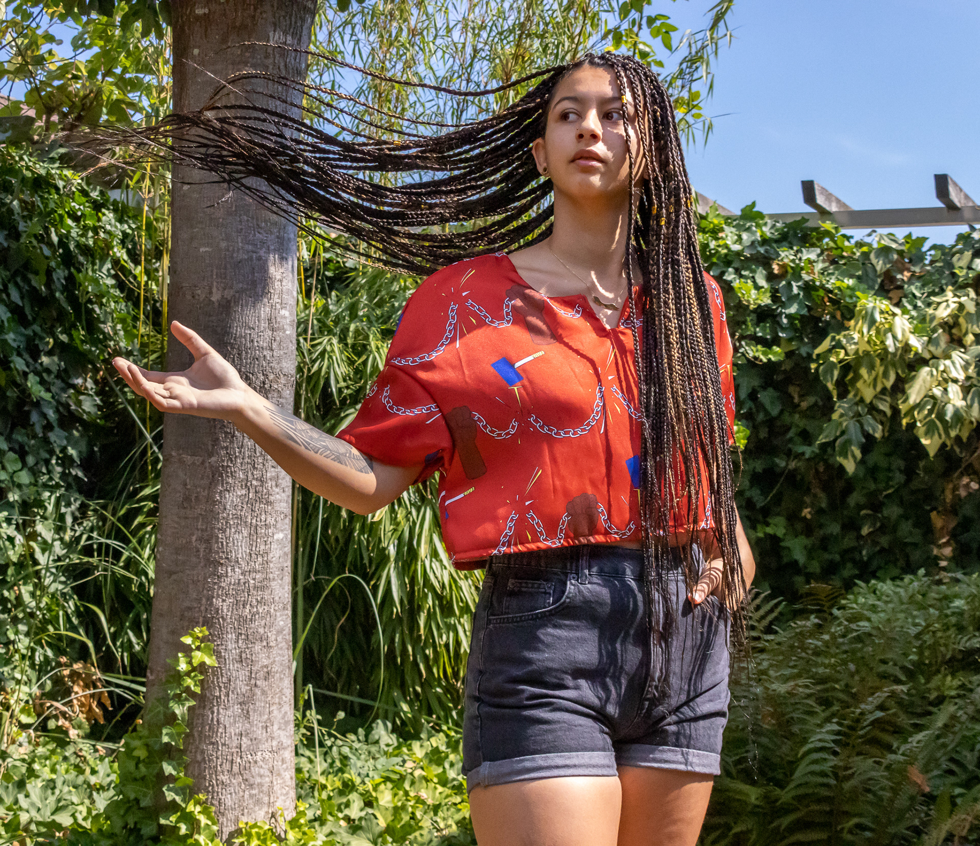 The red and green pattern is made of stretchy, recycled jersey, and the red and blue is made of satin-like, flowy recycled polyester.