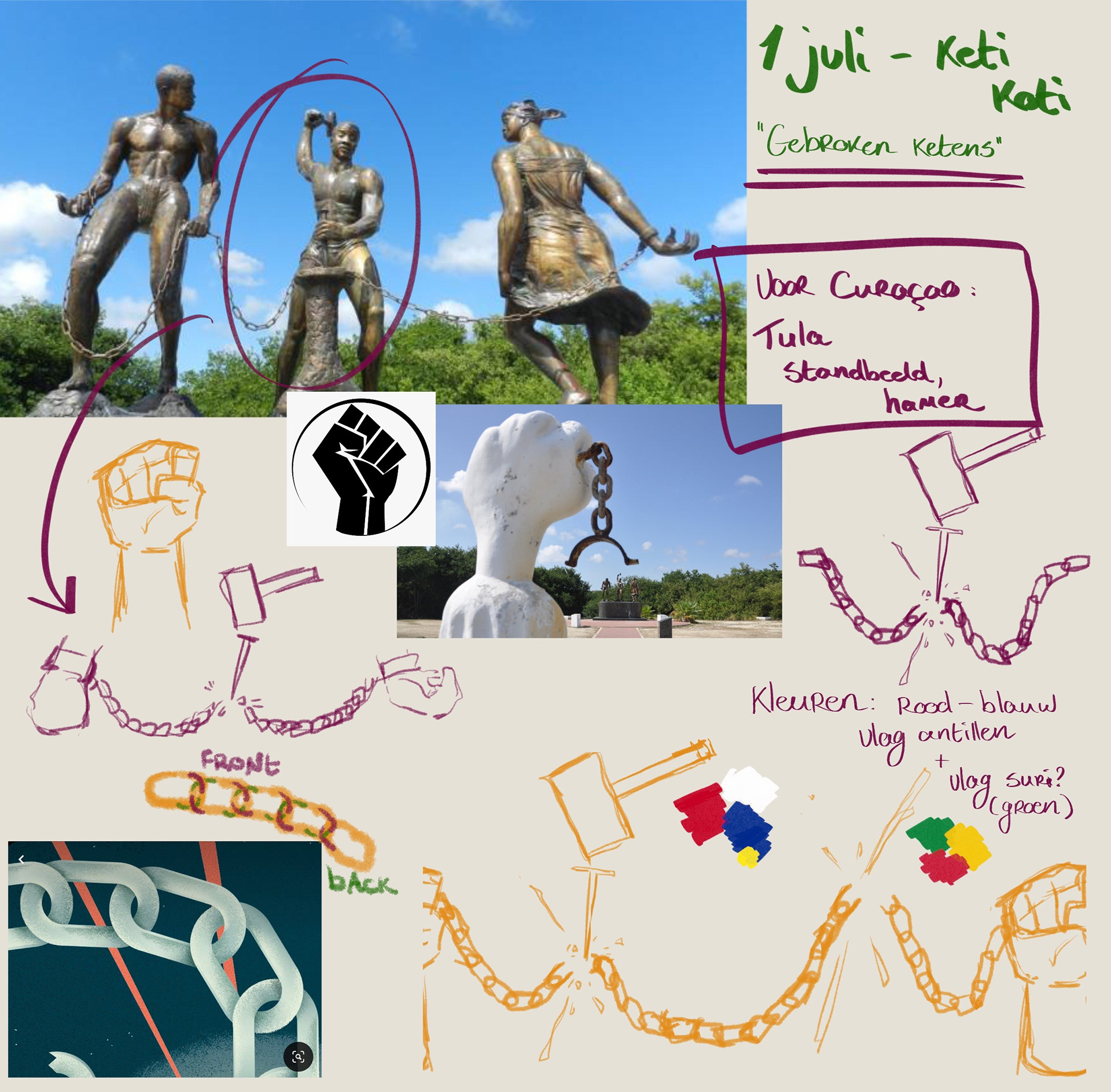 Right is the inspiration of the pattern. I incorporated the flags of the countries: red, green, and yellow for Suriname, blue and yellow for Curaçao, with red for the old flag of the Dutch Antilles. I didn't want to make it too complicated symbolically. Keti koti is Sranantongo for "broken chains".